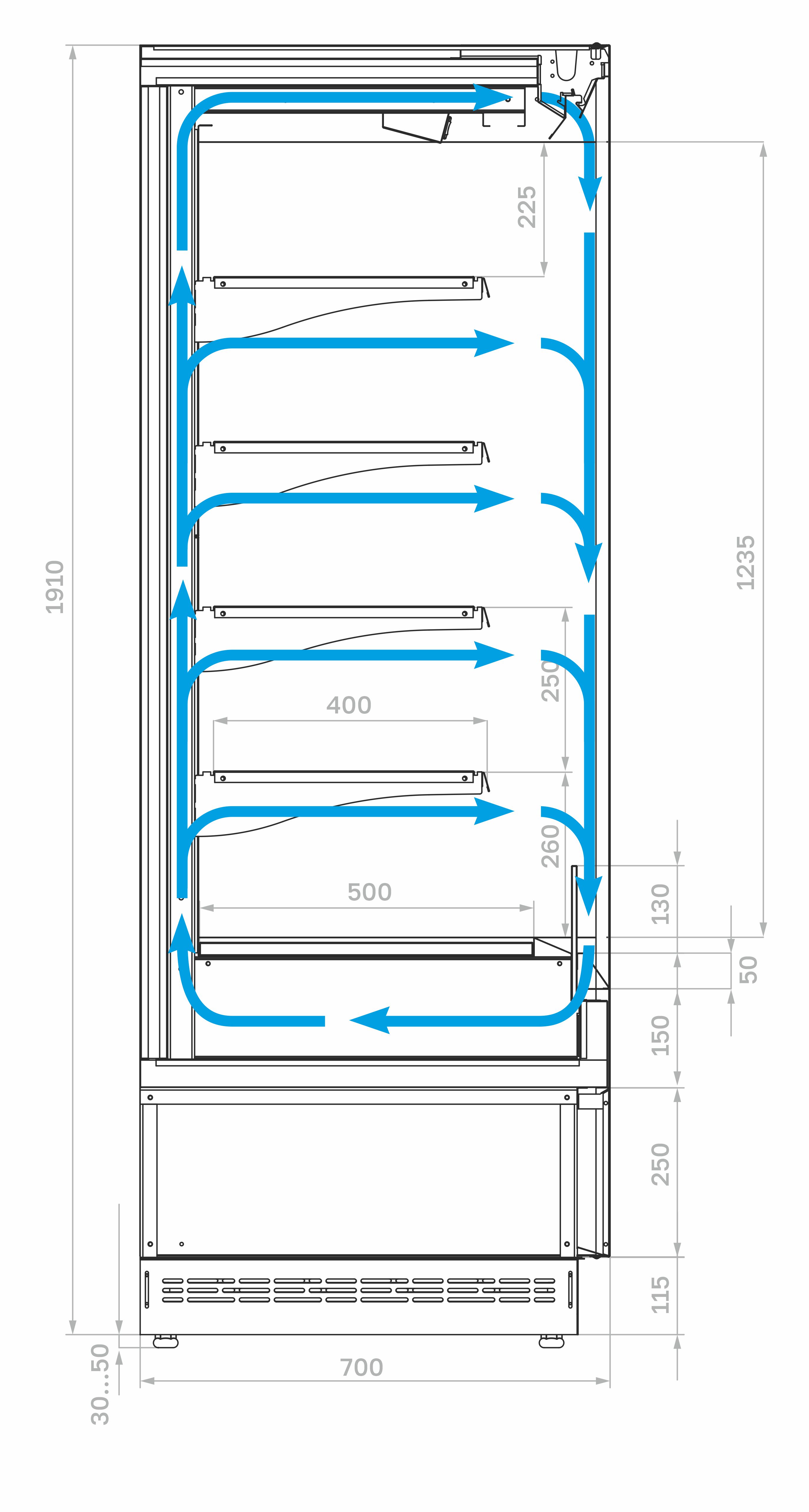• Боковины – металлические с зеркальным покрытием для улучшения обзора продукции и визуального расширения пространства