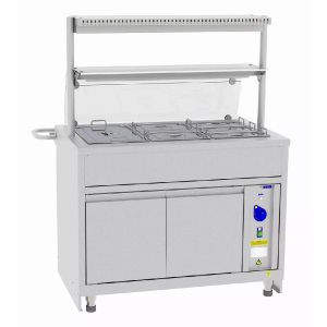 Электрический мармит кухонный 2-х блюд Abat Hot-line ЭМК-70Х с подогреваемой полкой применяется для поддержания в подогретом состоянии различных готовых блюд, включая супы и горячие вторые, перед подачей посетителям. Поддержание необходимой температуры осуществляется за счёт паровой ванны, в которую устанавливаются емкости с готовой продукцией. Модель дополнительно оснащена двумя полками для размещения блюд, одна из которых подогреваемая, и встроенным шкафом для расположения кухонного инвентаря. Прилавок можно использовать как в составе линий раздачи, так и в автономном режиме.
