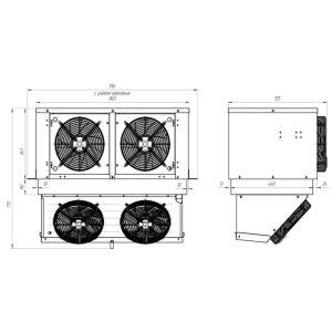 • Воздухоохладитель: два вентилятора по 0,14 кВт, диаметр — 250 мм, шаг ребер — 4,2 мм, расход воздуха — 1200 м³/ч, дальность струи — до 7 метров*