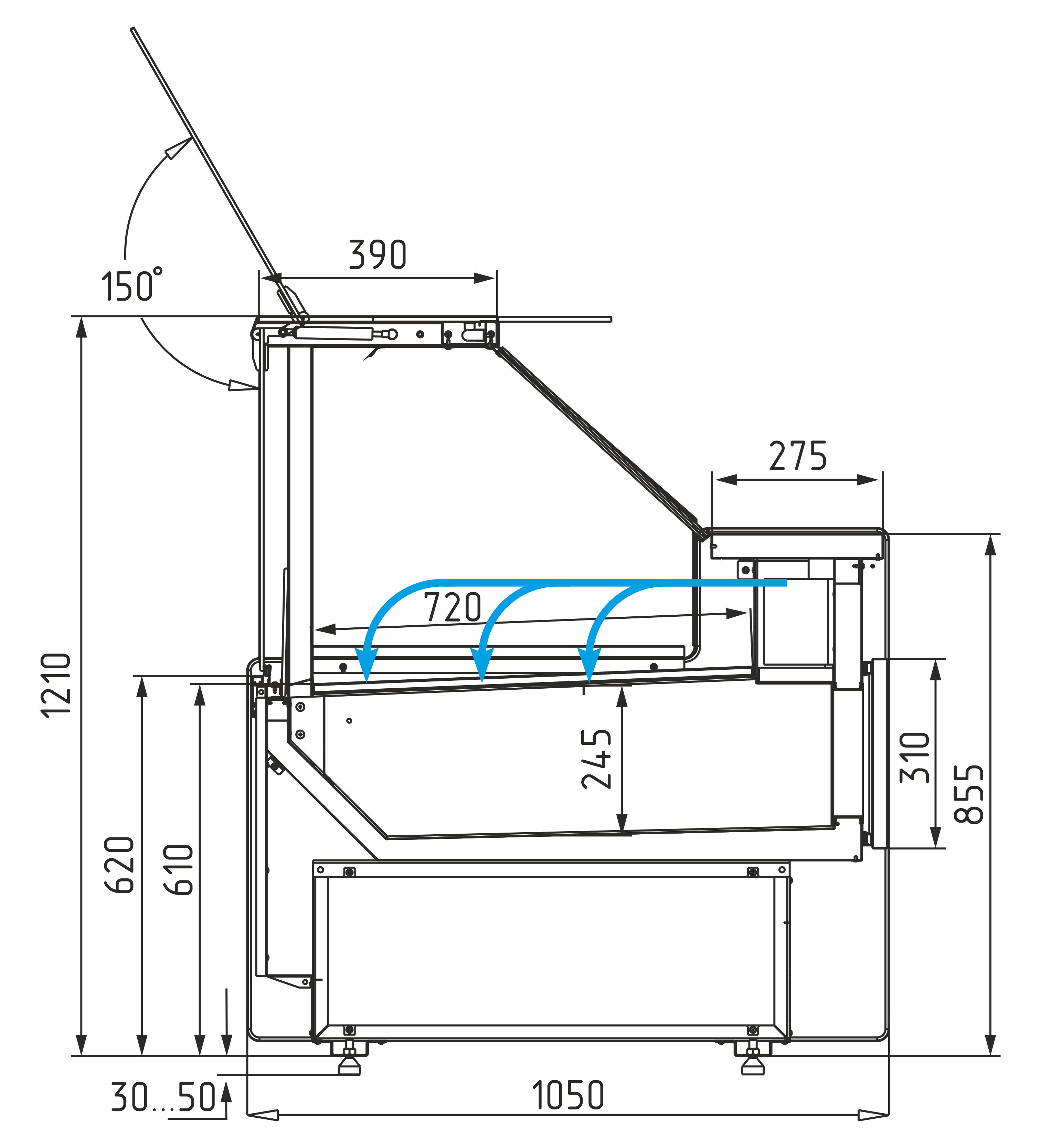 Подъёмное фронтальное стекло — удобный доступ для обслуживания и выкладки продукции.