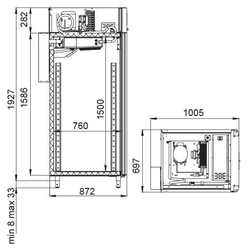 Каталог оборудования Холодильное оборудованиеШкафы холодильныеСпециализированные холодильные шкафыШкаф холодильный для вызревания салями Polair CS107 Salami черный, со стеклом Шкаф холодильный для вызревания салями Polair CS107 Salami черный, со стеклом Код товара: 062-632 Поделиться: WhatsAppTelegram СравнитьДобавить в КПВ избранное 0 373 915 ₽ В корзину 0 шт Под заказСамовывоз сегодня бесплатно Взять в кредит Купить в лизинг Получить консультацию в WhatsApp Описание Характеристики Отзывы 0 Инструкции 5 Шкаф холодильный для вызревания салями Polair CS107 Salami черный, со стеклом предназначен для приготовления и хранения салями, сыровяленых колбас и других мясных деликатесов на предприятиях общественного питания и торговли. Цельнозаливной монолитный корпус выполнен из нержавеющей стали снаружи и внутри (кроме задней стенки), что обеспечивает высокую прочность, долговечность и удобство ухода. Оборудование рассчитано на работу при температуре окружающей среды до +40 °С. Особенности: Динамическое охлаждение с мягким обдувом без заветривания Верхнее расположение агрегата Автоматическая оттайка с системой испарения конденсата Русифицированная многофункциональная панель управления с дисплеем диагональю 5" Возможность создания и сохранения индивидуальных программ Встроенный ультразвуковой увлажнитель (необходима подача очищенной воды и подключение к канализации) UV-лампа для обеззараживания воздуха внутри камеры Три уровня подвесов с тремя перекладинами и крюками на каждом уровне для удобной развески колбас Регулируемый уровень влажности: от 60 до 95 % Распашная дверь с заливной теплоизоляцией, встроенной ручкой и магнитным уплотнителем Отключаемая LED-подсветка камеры Штампованное углубление в дне корпуса для удобства ухода Педаль для удобного открытия двери Хладагент R290 (пропан) Толщина стенки корпуса: 43 мм Polair CS107 Salami черный, со стеклом — это профессиональный холодильный шкаф, идеально подходящий для цехов, гастробаров и мясных мастерских. Он обеспечивает оптимальные условия для дозревания и хранения деликатесов за счёт точного контроля температуры и влажности, продуманной конструкции и расширенного функционала. Такой шкаф помогает сохранять качество и вкус продукции на высоком уровне.Изображение товара, представленного на фото, может отличаться от его фактического вида. Показать все Габаритные размеры697×1005×1960 ммДиапазон рабочей температурыот -2 до +30 °CДлина697 ммШирина1005 ммВысота1960 ммОбъём700 лКол-во дверей1 Тип двериСтеклянная Уровень влажностиот 60 до 95 %Холодильный агрегатВстроенный Тип оттайкиАвтоматическая Тип охлажденияДинамическое ПодсветкаЕсть UV-лампаЕсть ХладагентR290 Вес нетто160 кгВес брутто190 кгБрендPolairВсе специализированные холодильные шкафы Из нержавейкиВсе специализированные холодильные шкафы Стеклянная дверь Оставить отзыв Еще никто не оставил отзыв на этот товар Схема POLAIR CS107 Salami.jpgИнструкция на POLAIR CS107 Salami.pdfБрошюра на POLAIR CS107 Salami.pdfДекларация о соответствии.pdfСертификат соответствия.pdf Похожие товары Перейти в каталог В наличии 405 365 ₽ Шкаф холодильный для хлебопекарных производств Polair CS107 Bakery Br черный, со стеклом (Тип 2) В наличии 186 231 ₽ Шкаф холодильный HURAKAN HKN-MA230 для созревания мяса Под заказ 282 471 ₽ Шкаф холодильный для вызревания мяса и сыра Carboma M700GN-1-G-MHC 0430 Под заказ 118 831 ₽ Шкаф холодильный HURAKAN HKN-MA100 для созревания мяса Под
