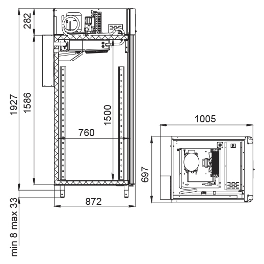 Каталог оборудования Холодильное оборудованиеШкафы холодильныеСпециализированные холодильные шкафыШкаф холодильный для вызревания салями Polair CS107 Salami со стеклом Шкаф холодильный для вызревания салями Polair CS107 Salami со стеклом Код товара: 062-631 Поделиться: WhatsAppTelegram СравнитьДобавить в КПВ избранное 0 385 050 ₽ В корзину 0 шт Под заказСамовывоз сегодня бесплатно Взять в кредит Купить в лизинг Получить консультацию в WhatsApp Описание Характеристики Отзывы 0 Инструкции 5 Шкаф холодильный для вызревания салями Polair CS107 Salami со стеклом предназначен для приготовления и хранения салями, сыровяленых колбас и других мясных деликатесов на предприятиях общественного питания и торговли. Корпус цельнозаливной конструкции выполнен из нержавеющей стали снаружи и внутри (кроме задней стенки), что обеспечивает высокую прочность и долговечность. Дверь выполнена в виде стеклопакета для удобного визуального контроля. Оборудование рассчитано на работу при температуре окружающей среды до +40 °С. Особенности: Динамическое охлаждение с мягким обдувом без заветривания Верхнее расположение агрегата Автоматическая оттайка с системой испарения конденсата Русифицированная многофункциональная панель управления с дисплеем 5" и возможностью создания и сохранения собственных программ Встроенный ультразвуковой увлажнитель (необходима подача очищенной воды и подключение к канализации) UV-лампа для обеззараживания воздуха внутри камеры 3 пары направляющих с тремя перекладинами и подвесами для колбас Регулируемый уровень влажности: от 60 до 95 % Распашная дверь с заливной теплоизоляцией, встроенной ручкой и магнитным уплотнителем Отключаемая внутренняя LED-подсветка Штампованное углубление в дне корпуса для удобства ухода Педаль для удобного открытия двери Хладагент R290 (пропан) Толщина стенки корпуса: 43 мм Polair CS107 Salami со стеклом — это профессиональный шкаф, разработанный специально для мясных деликатесов. Он обеспечивает оптимальные условия для ферментации и хранения продукции за счёт точного контроля температуры и влажности, продуманной конструкции и удобного функционала. Такой шкаф станет надёжным решением для мясных цехов, гастробаров и специализированных магазинов.Изображение товара, представленного на фото, может отличаться от его фактического вида. Показать все Габаритные размеры697×1005×1960 ммДиапазон рабочей температурыот -2 до +30 °CДлина697 ммШирина1005 ммВысота1960 ммОбъём700 лКол-во дверей1 Тип двериСтеклянная Уровень влажностиот 60 до 95 %Холодильный агрегатВстроенный Тип оттайкиАвтоматическая Тип охлажденияДинамическое ПодсветкаЕсть UV-лампаЕсть ХладагентR290 Вес нетто160 кгВес брутто190 кгБрендPolairВсе специализированные холодильные шкафы Из нержавейкиВсе специализированные холодильные шкафы Стеклянная дверь Оставить отзыв Еще никто не оставил отзыв на этот товар Схема POLAIR CS107 Salami.jpgИнструкция на POLAIR CS107 Salami.pdfБрошюра на POLAIR CS107 Salami.pdfДекларация о соответствии.pdfСертификат соответствия.pdf Похожие товары Перейти в каталог Под заказ 392 700 ₽ Шкаф холодильный для вызревания мяса Polair CS107 Meat черный, со стеклом (Тип 2) В наличии 405 365 ₽ Шкаф холодильный для хлебопекарных производств Polair CS107 Bakery Br черный, со стеклом (Тип 2) Под заказ 397 800 ₽ Шкаф холодильный для вызревания сыра Polair CS107 Cheese полки нерж., со стеклом Под заказ 389 300 ₽ Шкаф холодильный для вызревания мяс