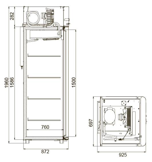 Каталог оборудования Холодильное оборудованиеШкафы холодильныеШкафы холодильные универсальные от -5 до +5 °СШкаф холодильный универсальный Polair CV107-Gm Alu Шкаф холодильный универсальный Polair CV107-Gm Alu Код товара: 062-610 Поделиться: WhatsAppTelegram СравнитьДобавить в КПВ избранное 0 149 175 ₽ В корзину 0 шт Под заказСамовывоз сегодня бесплатно Взять в кредит Купить в лизинг Получить консультацию в WhatsApp Описание Характеристики Отзывы 0 Инструкции 4 Шкаф холодильный универсальный Polair CV107-Gm Alu предназначен для демонстрации и надежного хранения продуктов на предприятиях общественного питания и торговли. Корпус шкафа цельнозаливной, выполнен из прочной стали с полимерным покрытием, что гарантирует высокую механическую прочность и длительный срок службы. Алюминиевые профили дверей и верхней панели подчеркивают современный, премиальный дизайн. Оборудование эффективно работает при температуре окружающей среды до 40 °С и влажности воздуха до 80%. Особенности модели: Многофункциональная контрольная панель (терморегулятор) для удобного управления параметрами. Жидкокристаллический дисплей, обеспечивающий чёткое отображение настроек и информации о работе шкафа. Клапан Шредера для удобного обслуживания холодильного контура. Распашной тип двери для легкого доступа к продуктам. Возможность изменить сторону открывания двери (при наличии опции), что делает установку более универсальной. Полностью интегрированные в профили дверей ручки, подчеркивающие стильный внешний вид и удобство использования. Встроенная светодиодная подсветка для отличной видимости содержимого шкафа. Надежный замок для защиты продуктов. Педаль для удобного открывания двери без использования рук. Высокая допустимая нагрузка на полку — до 40 кг, что позволяет хранить большие объемы продукции. Размер полки: GN 2/1 (530×650 мм), подходит для стандартных гастроемкостей. Толщина стенки корпуса — 43 мм, обеспечивающая отличную теплоизоляцию и снижение энергопотерь. Polair CV107-Gm Alu — это функциональный и стильный холодильный шкаф, который сочетает надежность, эргономичный дизайн и удобство эксплуатации. Использование прочных материалов и продуманная конструкция делают его идеальным решением для профессиональной кухни или торгового зала.Изображение товара, представленного на фото, может отличаться от его фактического вида. Показать все Габаритные размеры697×925×1960 ммДиапазон рабочей температурыот -5 до +5 °CДлина697 ммГлубина925 ммВысота695 ммОбъём700 лРазмер полки530×650 ммКоличество полок4 штКоличество дверей1 штТип оттайкиАвтоматическая Тип охлажденияДинамическое Тип управленияЭлектронное Материал корпусаНержавеющая сталь Тип двериМеталлическая ЗамокЕсть Способ открыванияРаспашные ХладагентR290 Холодильный агрегатВстроенный Расположение агрегатаВерхнее Потребление электроэнергии в сутки4,5 кВтПотребляемая мощность0,4 кВтНапряжение220 ВГабариты в упаковке800×1000×2150 ммВес нетто115 кгВес брутто140 кгБрендPolairВсе шкафы холодильные универсальные от -5 до +5 °С Из нержавейки Оставить отзыв Еще никто не оставил отзыв на этот товар Схема POLAIR CV107-Gm Alu.jpgИнструкция на POLAIR CV107-Gm Alu.pdfДекларация о соответствии.pdfСертификат соответствия.pdf Похожие товары Перейти в каталог В наличии 140 675 ₽ Шкаф холодильный универсальный Polair CV 110-S Под заказ 96 760 ₽ Шкаф холодильный универсальный Ангара 800 М Под заказ 204 204 ₽ Ш