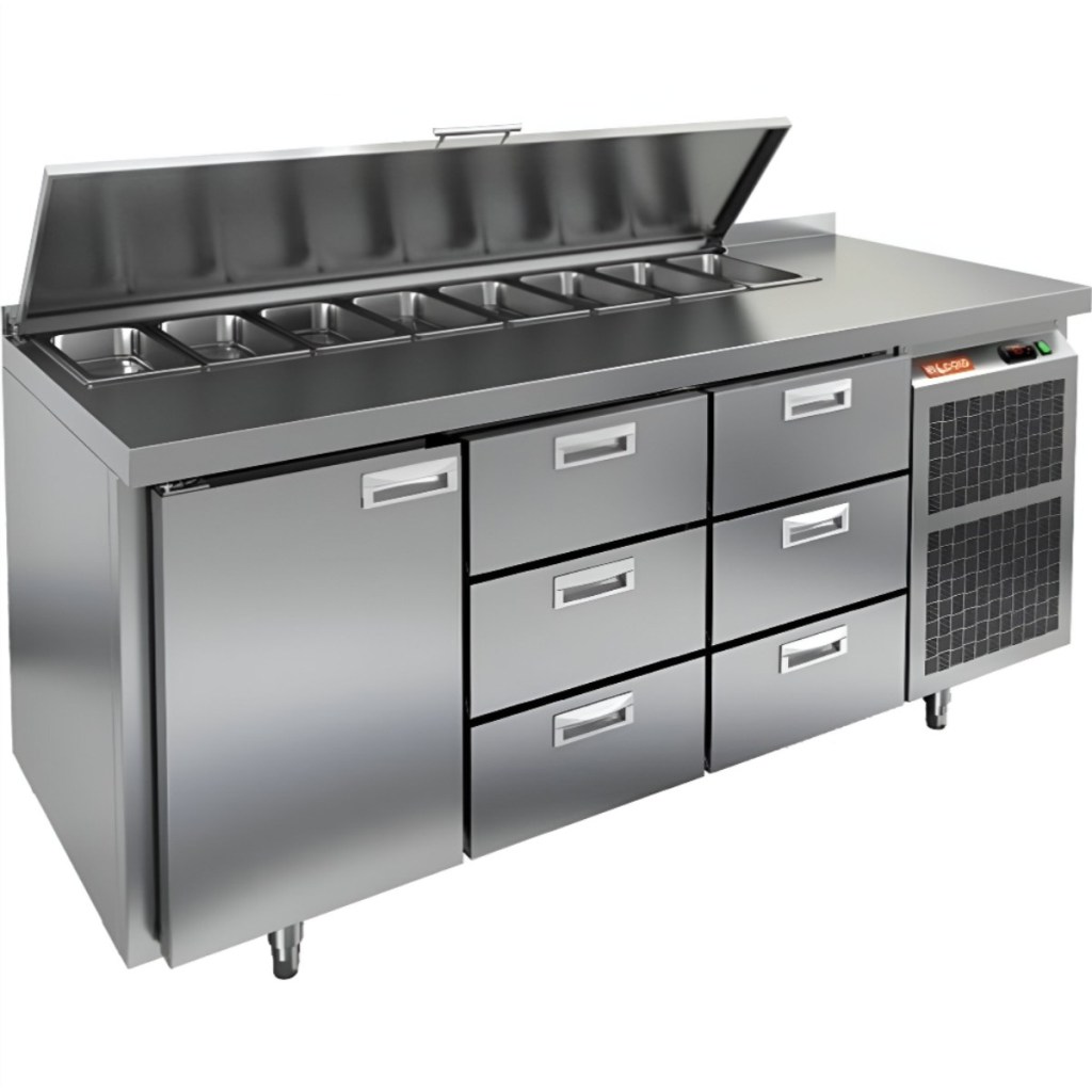 Каталог оборудования Холодильное оборудованиеСтолы охлаждаемыеСтолы холодильные для салатовСтол холодильный для салатов HiCold SL1-133GN (1/3) с крышкой Стол холодильный для салатов HiCold SL1-133GN (1/3) с крышкой Код товара: 064-848 Поделиться: WhatsAppTelegram СравнитьДобавить в КПВ избранное 0 209 962 ₽ В корзину 0 шт Под заказСамовывоз сегодня бесплатно Взять в кредит Купить в лизинг Получить консультацию в WhatsApp Описание Характеристики Отзывы 0 Стол холодильный для салатов HiCold SL1-133GN (1/3) предназначен для использования на предприятиях общественного питания и торговли. Он объединяет рабочую поверхность и охлаждаемый отсек, что делает его удобным решением для хранения, охлаждения и подготовки ингредиентов при приготовлении салатов, пиццы и других блюд. Такая конструкция позволяет повару работать быстрее и эффективнее, так как все необходимые продукты находятся под рукой. Корпус и столешница выполнены из прочной нержавеющей стали, устойчивой к коррозии и легко поддающейся санитарной обработке. Металлическая крышка защищает продукты от загрязнений и сохраняет их свежесть. Особенности модели: Электронная панель управления — точная настройка температурного режима. 1 глухая дверь — удобный доступ к холодильному отсеку. 6 выдвижных ящика — быстрое размещение и замена продуктов. Вместимость салат-бара — до 8 гастроемкостей глубиной до 100 мм. Автоматические доводчики дверей с фиксацией в открытом положении. Легкозаменяемые магнитные уплотнители — надежная герметичность. Открытая агрегатная часть — быстрый доступ для обслуживания. Регулируемые по высоте ножки — устойчивость даже на неровном полу. Толщина столешницы, борта и теплоизоляции — 50 мм, что обеспечивает прочность и энергоэффективность конструкции. HiCold SL1-133GN (1/3) — практичное и удобное решение для профессиональной кухни, обеспечивающее удобную подготовку и хранение ингредиентов. Изображение товара, представленного на фото, может отличаться от его фактического вида. Показать все Габаритные размеры1835×700×850 ммДиапазон рабочей температурыот +2 до +10 °CРасположение агрегатаБоковое Материал столешницыНержавеющая Тип столаС дверьми и ящиками Тип двериГлухая Объём505 лКоличество дверей1 штТип гастроемкостейGN 1/3 Количество ящиков6 штРазмер полки530×325 ммНапряжение220 ВМощность0,46 кВтТип охлажденияДинамическое Тип оттайкиАвтоматическая СтолешницаС бортом Габариты в упаковке2000×850×1000 ммВес нетто130 кгВес брутто185 кгБрендHicold Оставить отзыв Еще никто не оставил отзыв на этот товар Ранее просмотрено Под заказ 320 392 ₽ Стол холодильный для салатов HiCold SL1-2222GN (1/3) с крышкой Под заказ 255 412 ₽ Стол холодильный для салатов HiCold SL1-222GN (1/3) без крышки Под заказ 105 200 ₽ Витрина кондитерская Carboma KC70 N 0,9-2 Light Паттерн (0110 Мариель) хлебная, без стекла Под заказ 139 671 ₽ Стол холодильный для салатов HiCold SL1-11SN (1/3) О без крышки Под заказ 133 282 ₽ Стол холодильный для салатов HiCold SLE3-11GN полипропилен, без крышки Под заказ 100 700 ₽ Витрина кондитерская Carboma KC70 N 0,6-1 Light Bread Паттерн (0106 Седой дуб) хлебная, со стеклом Под заказ 148 402 ₽ Стол холодильный для салатов HiCold SL1-11GN (1/3) О З с крышкой