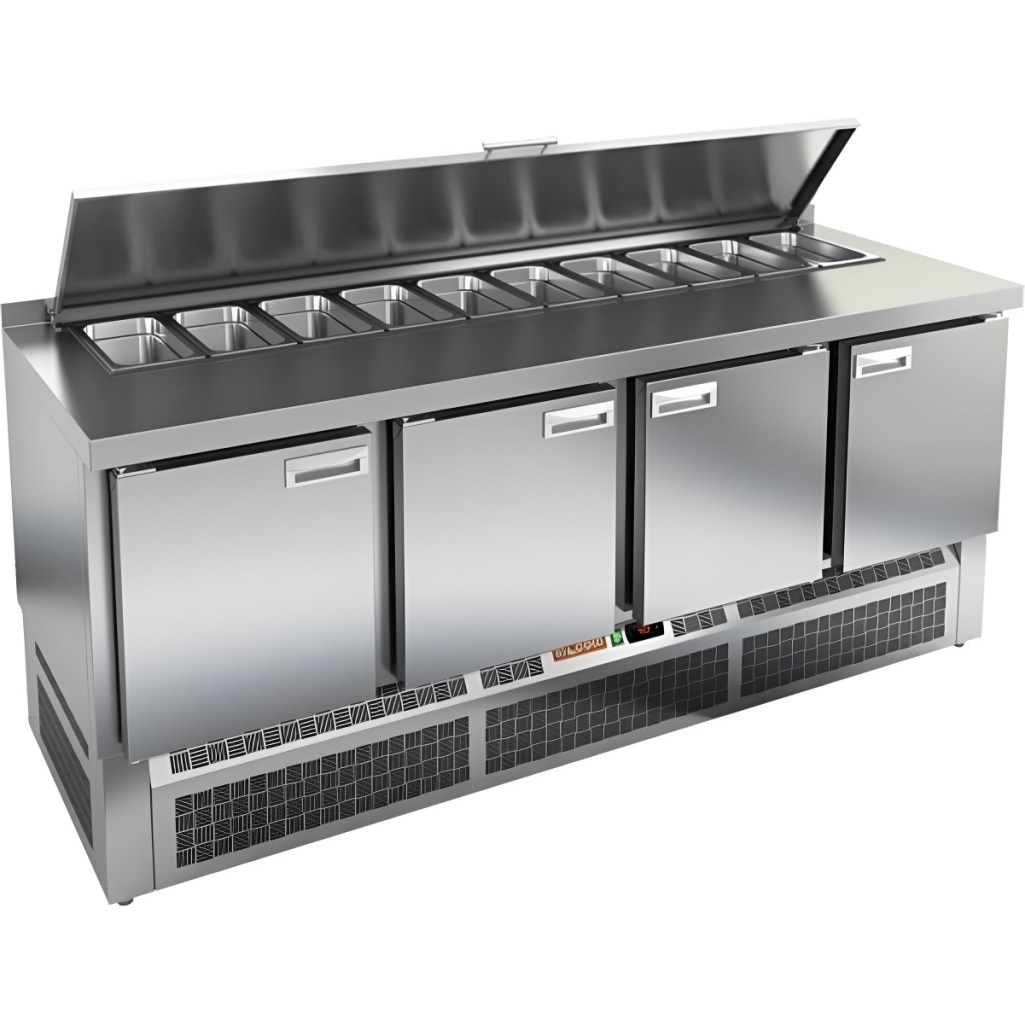 Модель сочетает в себе прочную рабочую поверхность и охлаждаемый внутренний объем, что упрощает процесс приготовления: все необходимые ингредиенты всегда под рукой. Корпус и столешница изготовлены из нержавеющей стали, устойчивой к воздействию влаги, механическим повреждениям и легко поддающейся