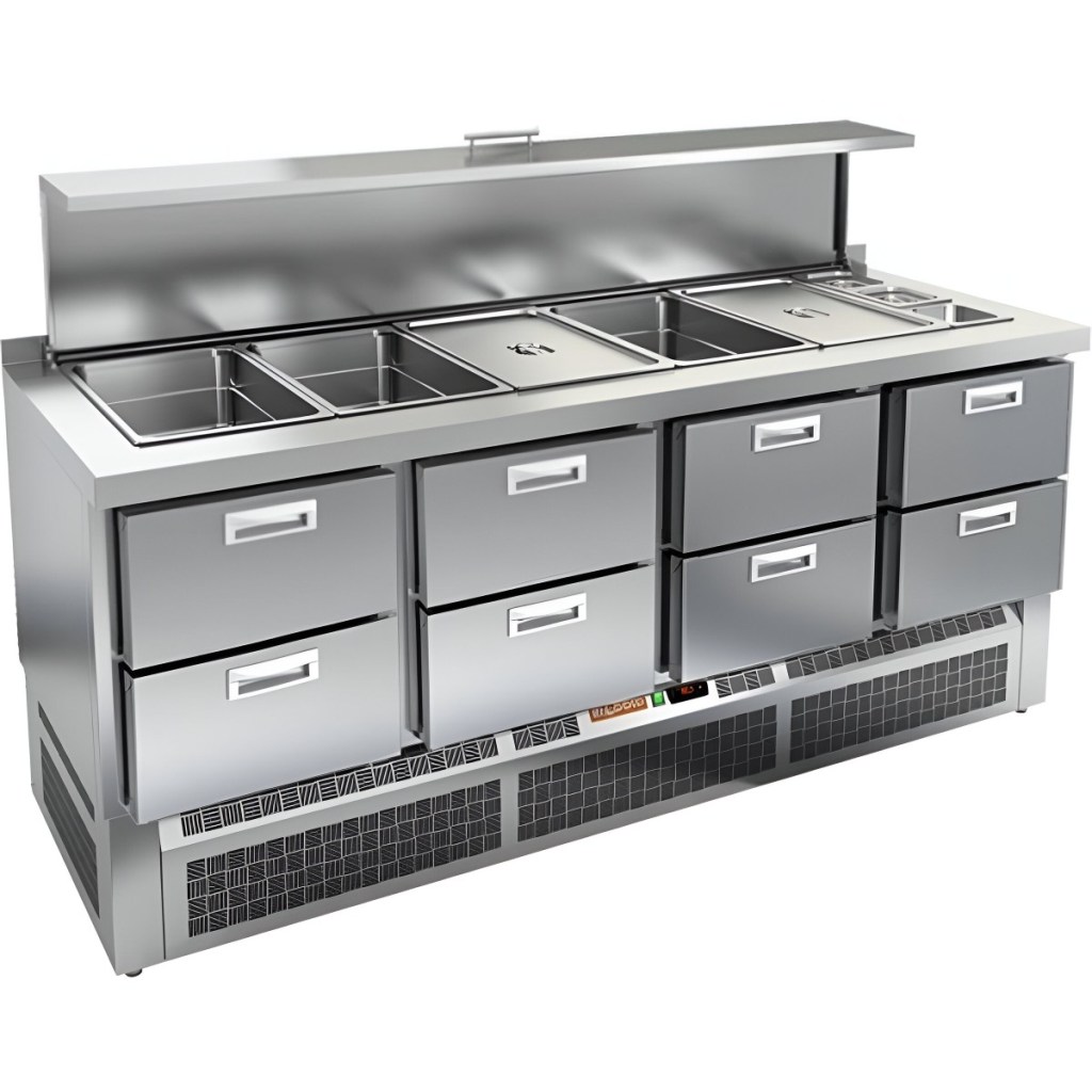 Модель обеспечивает удобный доступ к продуктам и позволяет повару работать максимально эффективно. Корпус и столешница изготовлены из нержавеющей стали, что гарантирует долговечность конструкции, устойчивость к коррозии и соответствие санитарным нормам. Металлическая крышка защищает продукты от загрязнений и сохраняет их свежесть.
