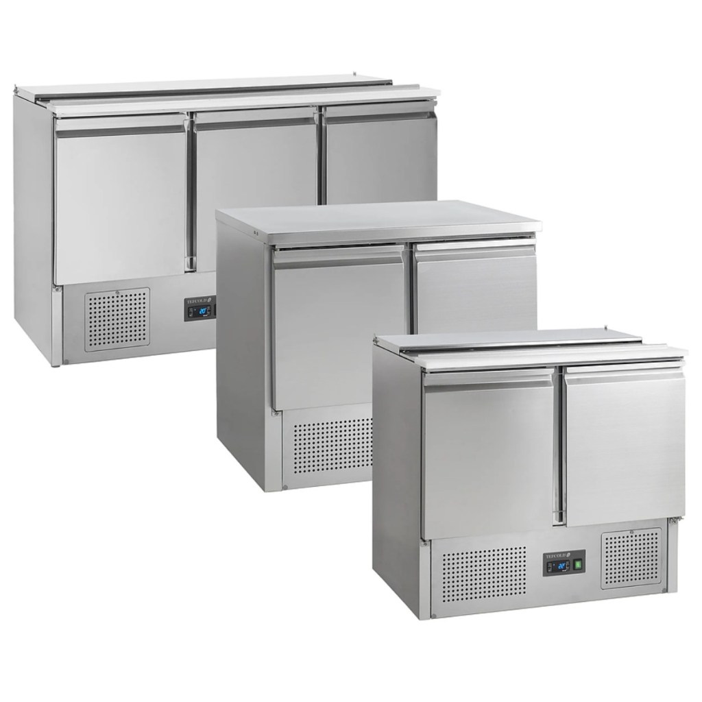 Каталог оборудования Холодильное оборудованиеСтолы охлаждаемыеСтолы холодильные для салатовСтол холодильный для салатов TEFCOLD SA920 Стол холодильный для салатов TEFCOLD SA920 Код товара: 010-377 Поделиться: WhatsAppTelegram СравнитьДобавить в КПВ избранное 0 92 803 ₽ В корзину 0 шт В наличииСамовывоз сегодня бесплатно Взять в кредит Купить в лизинг Получить консультацию в WhatsApp Описание Характеристики Отзывы 0 Стол холодильный для салатов TEFCOLD SA920 — профессиональное оборудование для обработки ингредиентов, приготовления салатов, охлаждения и кратковременного хранения продуктов на предприятиях общественного питания и торговли. Корпус и внутренняя отделка выполнены из нержавеющей стали AISI 304, что обеспечивает долговечность, гигиеничность и лёгкость ухода. Особенности модели: Статическое охлаждение с вентилятором — равномерное распределение температуры Автоматическое размораживание — поддержка стабильного режима без наледи Электронный термостат и градусник — точный контроль температуры Хладагент R134a, подзарядка — 0,165 кг Рабочая поверхность для нарезки и открытый верх под гастроёмкости 2 полки для удобной организации внутреннего пространства Регулируемые по высоте ножки — устойчивость на неровной поверхности Климатический класс 4 — работа при температуре до +30 °C Полезный объём: 230 л Размеры полки: 530×325 мм Внутренние размеры камеры: 830×515×500 мм Энергопотребление: 2,1 кВт/сутки Уровень шума: 42 дБ TEFCOLD SA920 — надёжный и компактный холодильный стол для профессиональных кухонь и предприятий общественного питания. Он сочетает рабочую поверхность для нарезки, эффективное охлаждаемое пространство и удобное управление температурой, обеспечивая сохранность продуктов и комфорт в работе.Изображение товара, представленного на фото, может отличаться от его фактического вида. Показать все Габаритные размеры900×700×877 ммДиапазон рабочей температурыот +2 до +10 °CРасположение агрегатаНижнее Материал столешницыНержавеющая Тип столаС дверьми Тип двериГлухая Общий объем260 лПолезный объем230 лКоличество дверей2 штРазмер полкиGN1/1 ммНапряжение230 ВРасход электроэнергии в сутки2,1 кВт/сутТип охлажденияДинамический Тип оттайкиАвтоматическая ХладагентR600a Габариты в упаковке980×770×1040 ммВес нетто70 кгВес брутто81 кгБрендTefcold Оставить отзыв Еще никто не оставил отзыв на этот товар Похожие товары Перейти в каталог В наличии 87 968 ₽ Стол холодильный среднетемпературный Polair ТМ2-G В наличии 64 485 ₽ Стол холодильный среднетемпературный Cooleq S901 Под заказ 85 405 ₽ Стол холодильный среднетемпературный Cooleq SNACK2100TN/600 В наличии 65 229 ₽ Стол холодильный среднетемпературный HURAKAN HKN-GNL2TN Ранее просмотрено Под заказ 722 667 ₽ Бункер для льда Scotsman UBH 1100