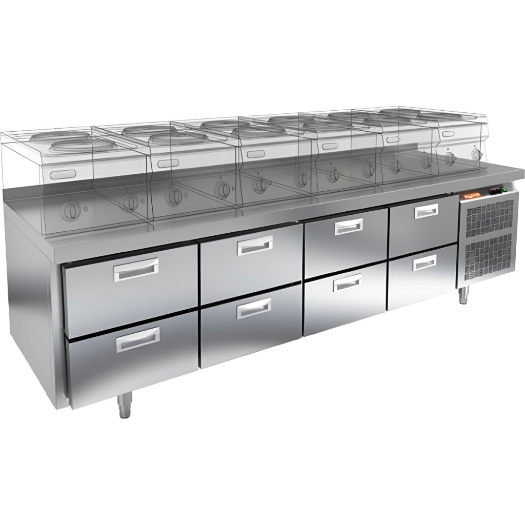• 8 выдвижных ящиков обеспечивают удобный доступ к продуктам и рациональную организацию пространства.