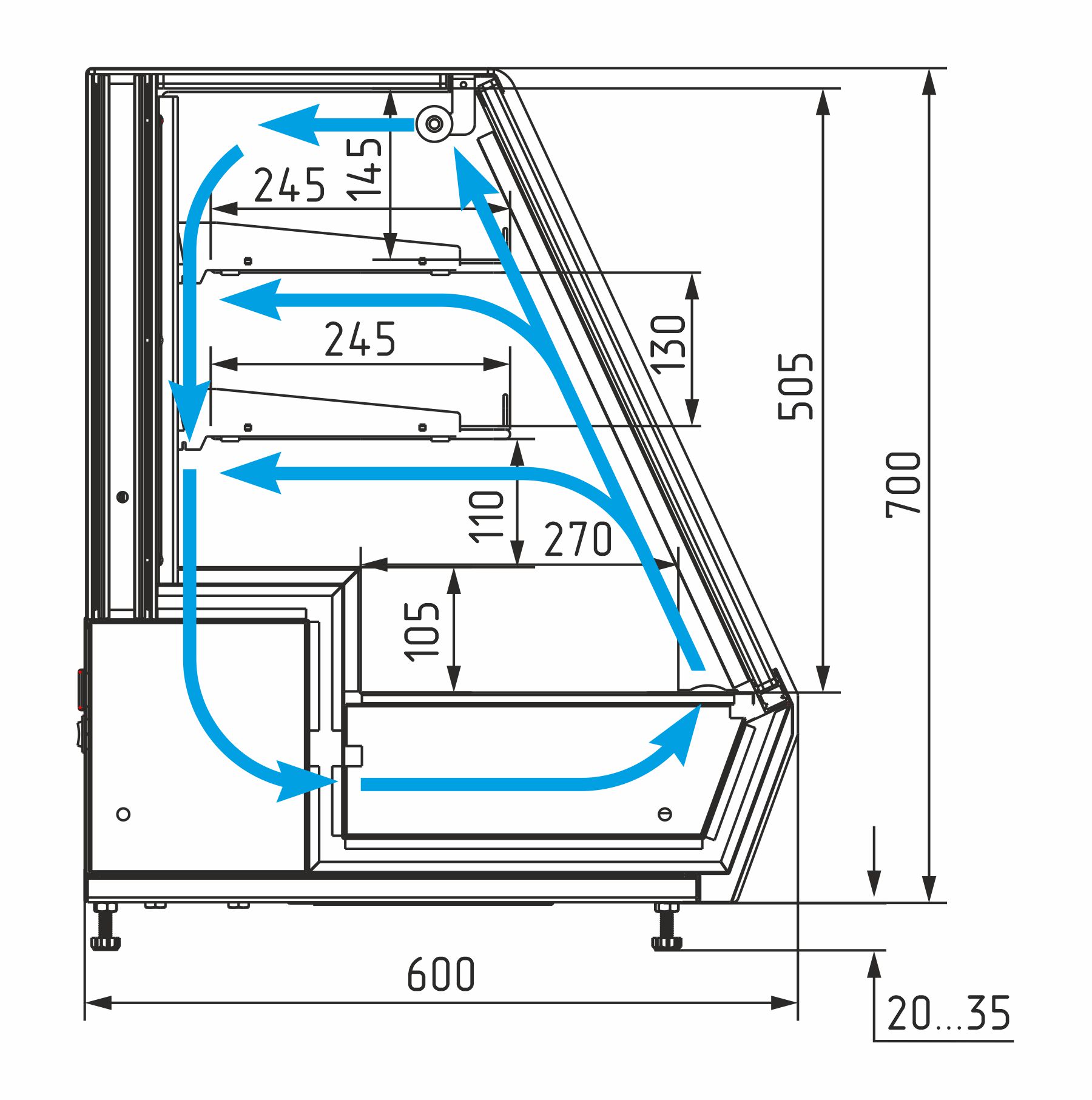 Высота выкладки продуктов: до 150 мм на нижнем поддоне, до 100 мм на полках.