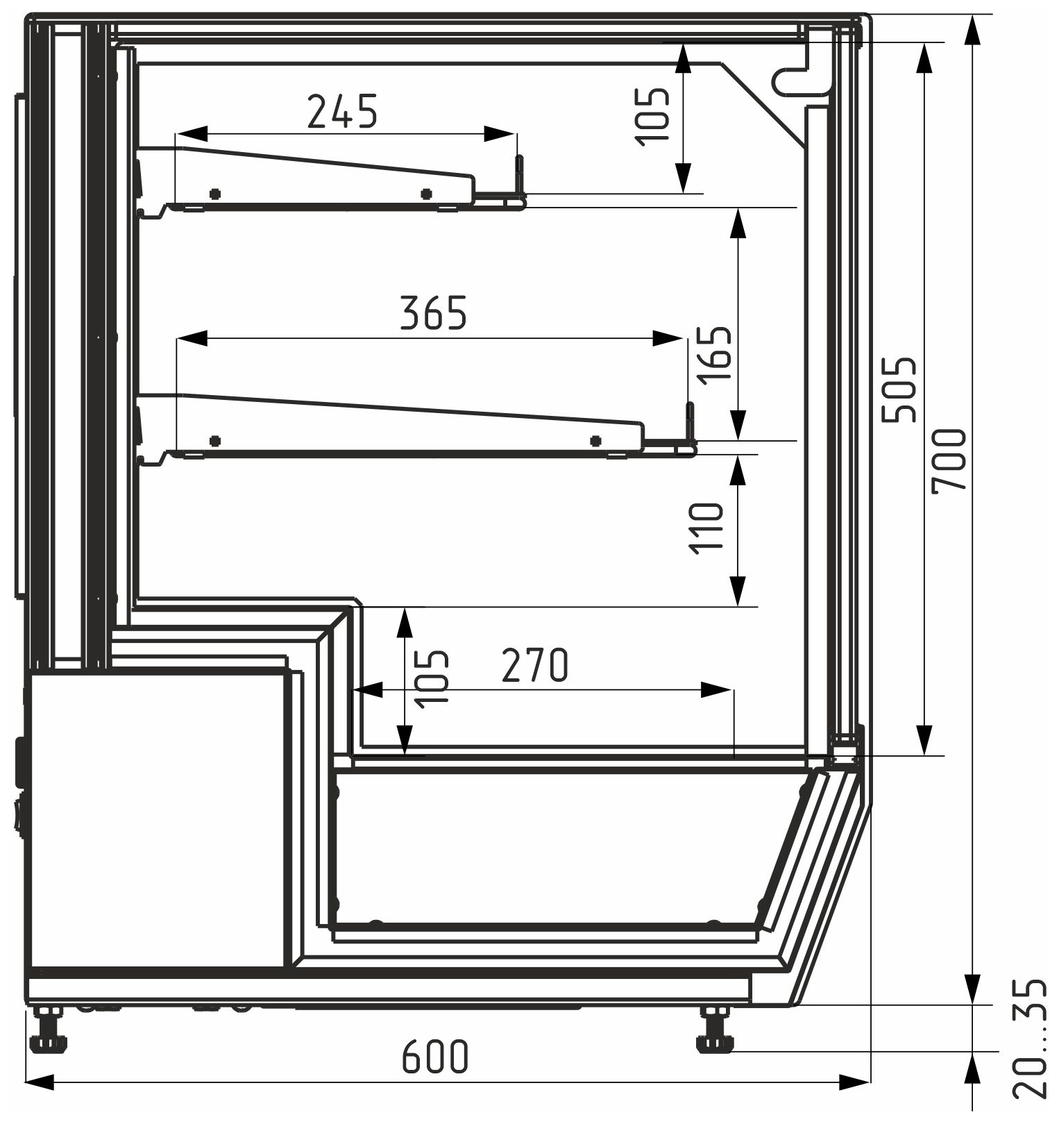 Максимальная высота выкладки продуктов: на нижнем поддоне — до 150 мм, на полках— до 100 мм.